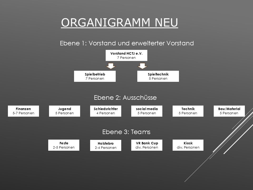 Künftig sollen Aufgaben breiter verteilt und in Ausschüsse ausgelagert werden. Zudem wird der Vorstand – insbesondere in den Bereichen Spielbetrieb und Spieltechnik – erweitert, um der steigenden Zahl von über 30 Mannschaften gerecht zu werden. Erste Ausschüsse, wie der Schiedsrichter- und der Jugendausschuss, sind bereits erfolgreich gestartet. In den Bereichen Finanzen, Technik und Social Media wird weiterhin Unterstützung gesucht.